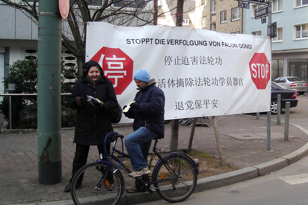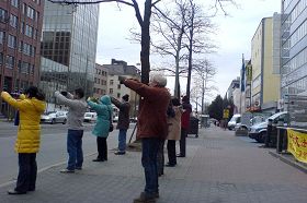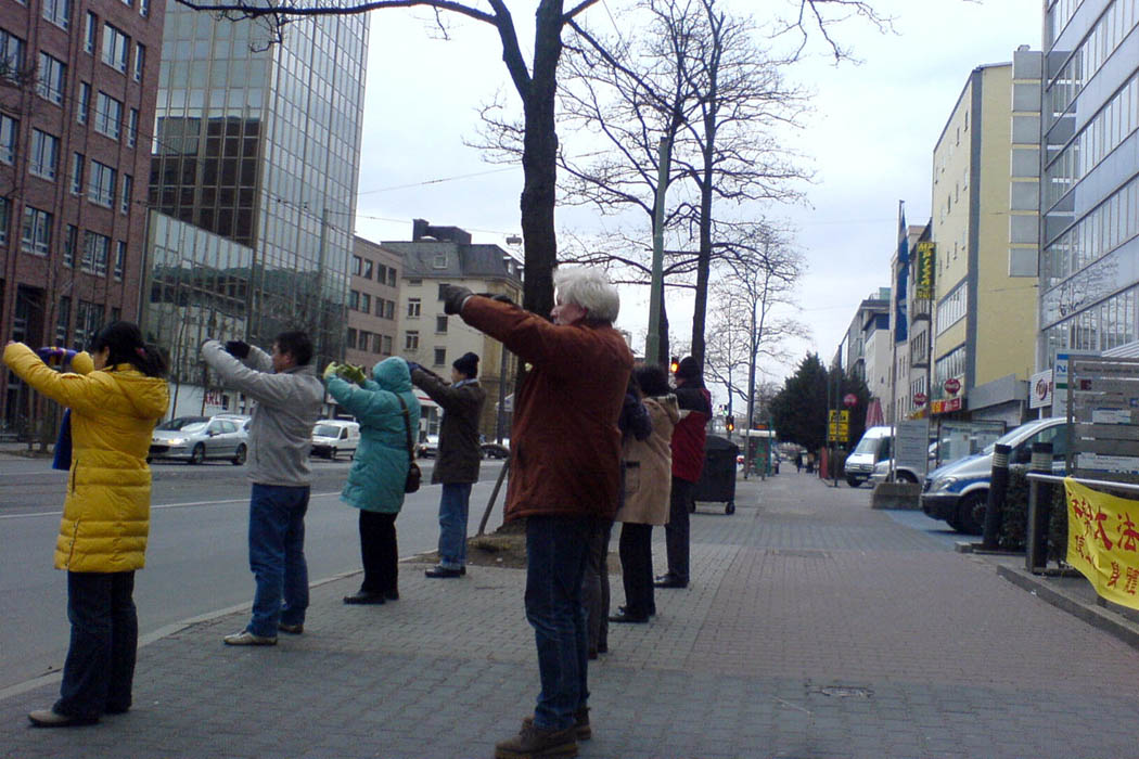 二月一日下午,二十多位法轮功学员来到中共驻法兰克福领事馆前,在严寒中平和的炼功,和抗议迫害。音乐声一起,学员们自发的站出整齐的队列,并为路人留出通畅的道路。整个抗议过程平和庄严,散发着正义和慈悲的力量。路过的人们普遍接受传单,有些还停下询问详情。在旁执勤的德国警察微笑着说:“几年来你们都是这么平和,我们很清楚。”