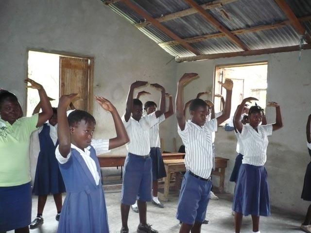 我们在海地建立了第一个炼功点:是星期六早上七点在le Croix des Bouquets市的一所中学内。