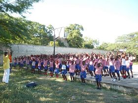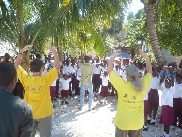 好几个学校负责人邀请我们去介绍法轮功。在一个月的时间里,我们总共去了四个小学、四个中学,每个地方我们差不多用了两个小时的时间来介绍法轮功,向每一个班级演示法轮功(每个班将近有30个学生),告诉他们与海地法轮功责任人的电话联系方式、大法网站等。向师生们揭露中共对法轮功的迫害,学生们都听得很认真,有的还提出一些很有意思的问题,例如,多大年纪才可以炼功?为什么这个功法在中国受到迫害?怎样在我们学校建立一个炼功点?在多少个国家有人们炼法轮功?等等。