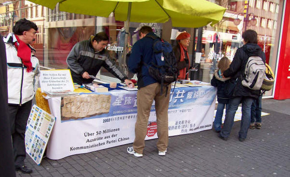 有一群从大陆来德国的留学生看到五千万中国人退出中共邪党的横幅后,在人群中交头接耳。一位退党义工问他们是否“三退”(退党、退团、退队)了?有的说曾加入过邪党的团、队组织;并问:退了有什么好处呢?义工告诉他们:天要灭中共!三退保命、保平安,对于每一个人来说,这不是最大的好处吗?你的生命、平安是金钱能换得来的吗?还告诉他们:现在不退,回去可以在大纪元网站用化名三退。最后义工提醒他们:要珍惜从大陆出来的机会多找真相,在大陆网络被过滤封杀,没有真实的咨询,想退党登录全球退党服务中心的网站都难,千万不要错过自救的机缘。他们中有的人表示已经上退党网站办了“三退”手续。