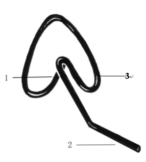 悬挂时,选一把可伸缩(3—5米)的鱼竿,把鱼竿的顶部连接鱼线的地方去掉,把图中所示(2)插入露出的空管内(2的弧度尽量大些),把鱼竿展开,根据被悬挂物(如电话线等)的粗细,调整图中(1)的大小,悬挂时把被悬挂物(如电话线等)放在图中(1和2)的夹角处,用力下拉即可。
