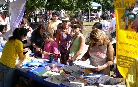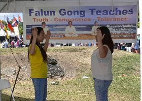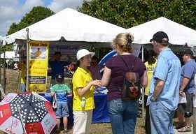 南佛州法轮大法协会的展位前游人络绎不绝,尤其是大法弟子舒缓优美的炼功动作让游人驻足,很多人都禁不住询问更多的法轮功(又称法轮大法)信息,也有相当多的人说他们知道一些法轮功的情况,在中共统治下被非法禁止。