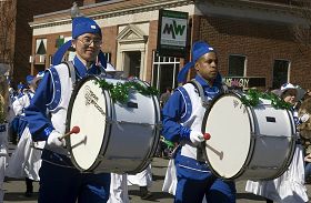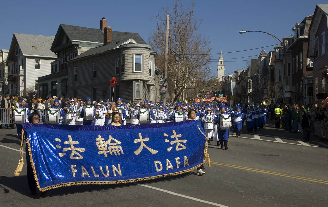 “法轮大法”队是由天国乐团、电动机车队和舞龙队组成。天国乐团成员身着写着大大的「乐」字的宋朝官服亮相,其醒目的服装、雄壮威武的乐声、整齐的节奏,成为今年波士顿圣派翠克节大游行的一大焦点,博得现场观众的阵阵掌声和热烈欢呼。
