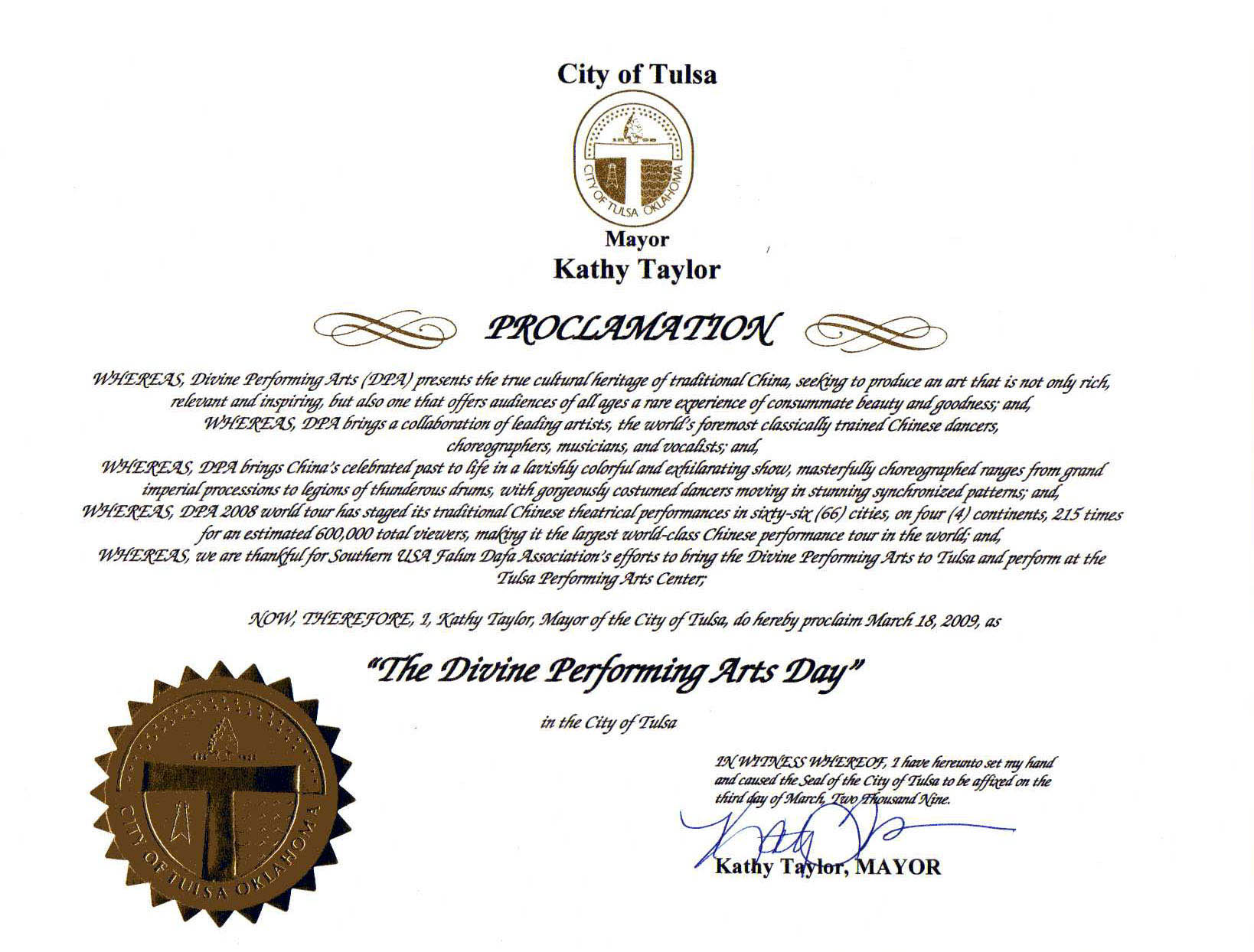因此,我Tulsa City市长,Kathy Taylor,特别把二零零九年三月十八日定为神韵艺术日。