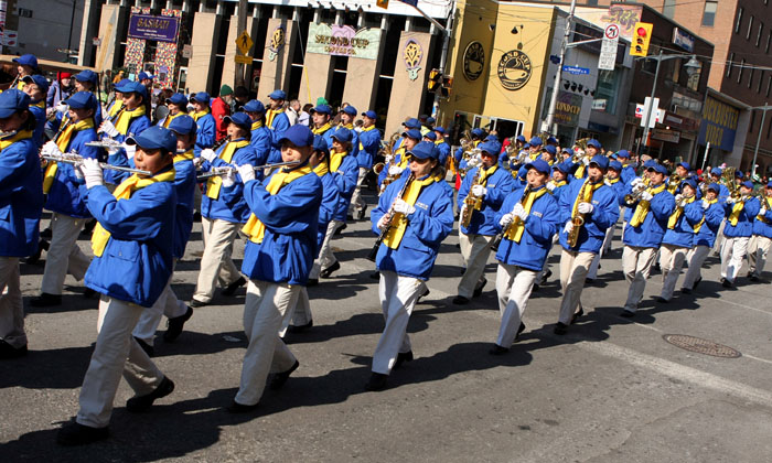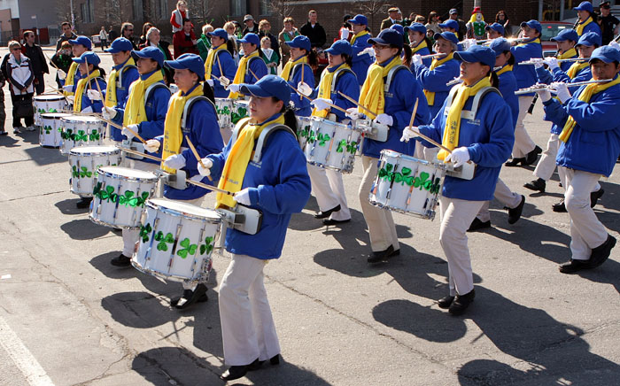 整洁的装束、整齐的步伐,伴着气势恢宏的乐曲,天国乐团为圣·派翠克节带来了庄严与神圣。天国乐团演奏了《法轮大法好》、《法鼓法号震十方》、《法正乾坤》、《送宝》等乐曲,沿途市民驻足观看、拍照,并报以热烈的掌声和欢呼声。许多市民主动索取有关法轮功的真相资料。