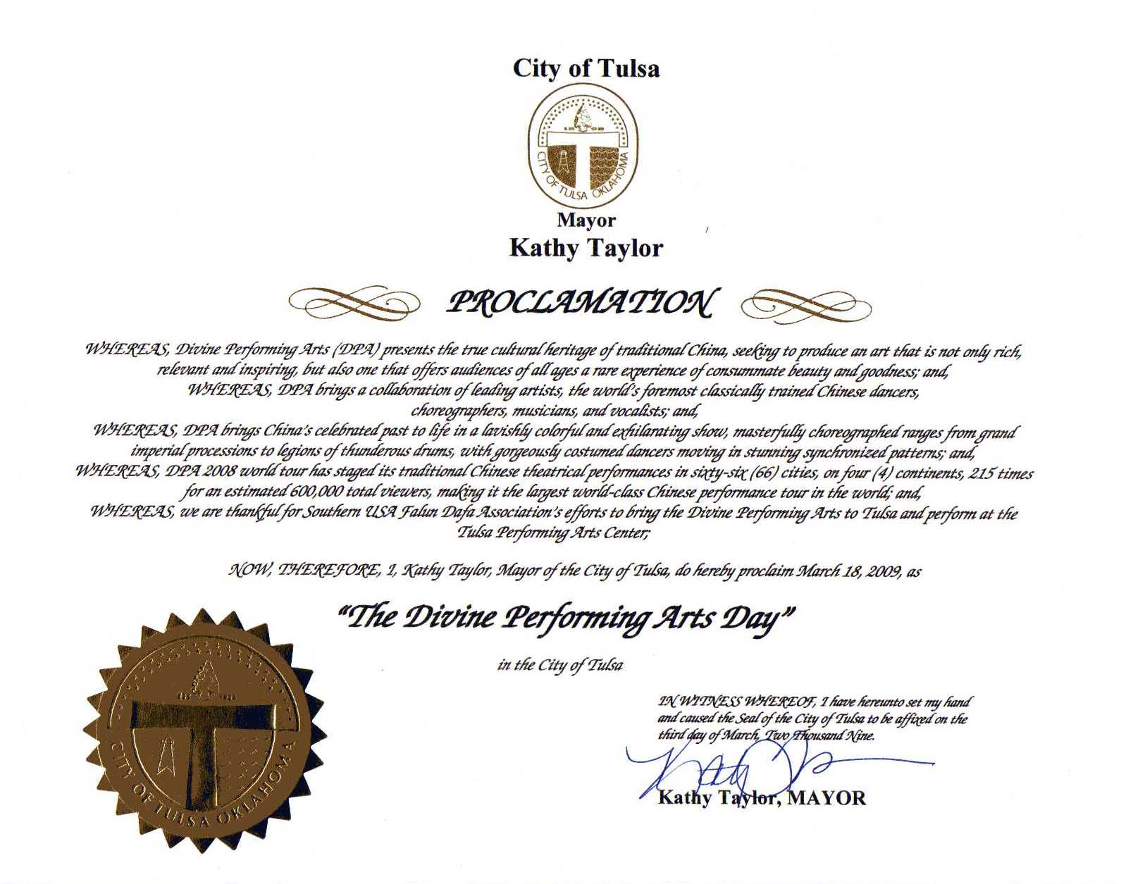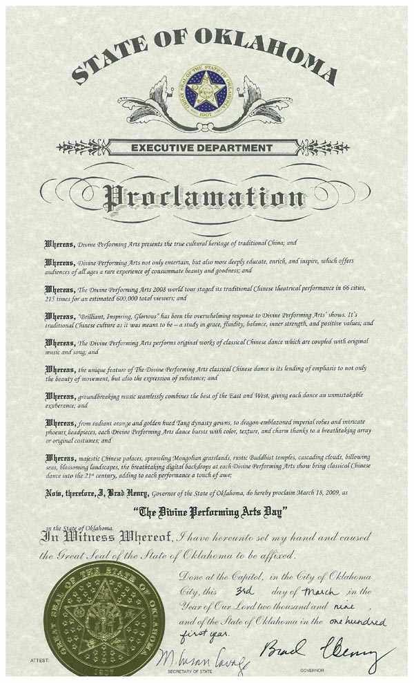 俄克拉荷马州州长命名二零零九年三月十八日为“神韵日”