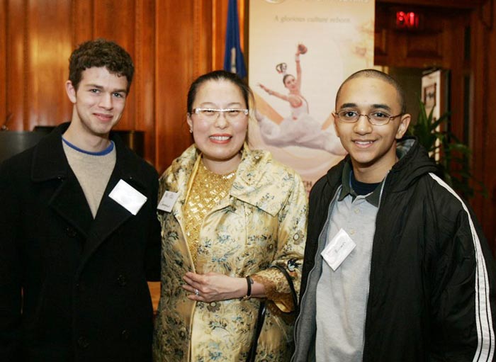 ![]() 康州冠军中文学院创办人、执行长周佩佩女士(中)同她的两位洋学生一同观看神韵演出 |