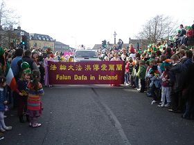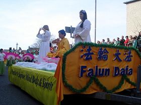 游行穿过的市中心街道两边的观众里三层、外三层,街道两旁墙上、楼房窗户里无不挤满人。法轮功学员们把大法的福音带给了这一方众生。