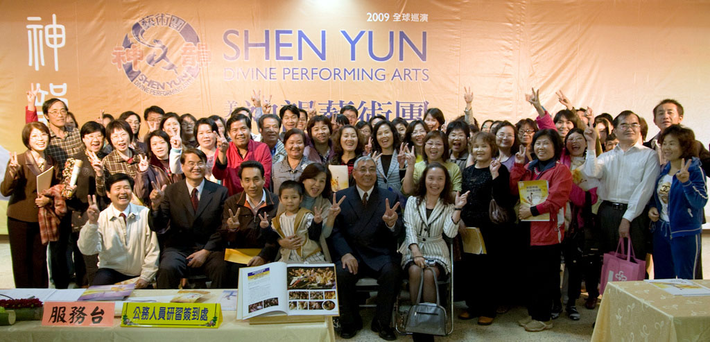 今年台湾许多政界、工商界、艺文界的精英,不仅自己慕名而来,还“组团”与亲友一同欣赏神韵。台北县五金界的“新海五金联谊会”与“融融会”,会员人数约六十人,今年将“观赏神韵”列为年度活动,加入亲友人数之后,组成一百七十人声势浩大的团体前来观看。散场之后,还轮流在神韵晚会巨幅海报前合影留念,引起旁人一阵关注。