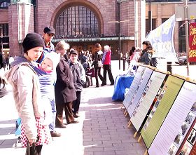 二零零九年四月十一日,是自去年冬天以来赫尔辛基少有的一个好天气,阳光明媚,春意融融,芬兰法轮功学员来到赫尔辛基中心火车站,在北侧的广场举行活动,向人们介绍法轮功和发生在中国的迫害详情。