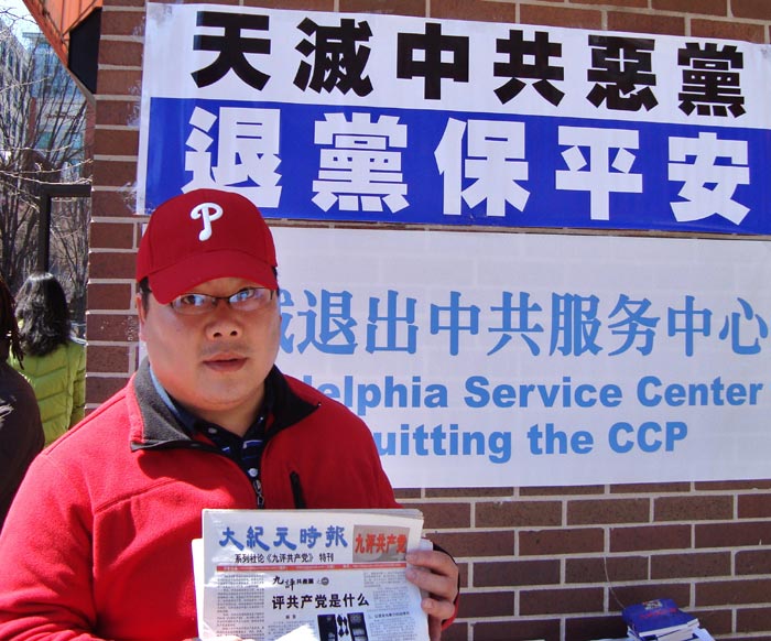雷先生问,如果国内的很多亲友也想办理“三退”,该怎么办?费城退出中共服务中心负责人林女士说:“我们每周六、日都在中国城牌楼下设有服务台,为广大侨胞及其国内的亲友办理三退手续。只要你征得亲朋好友本人同意,我们就可以给他们在大纪元‘三退’网站上发表声明,用真名、小名、化名都可以,一样有效。另外,你可以打我们的热线电话 215-906-2017给您自己或亲友办理‘三退’。”