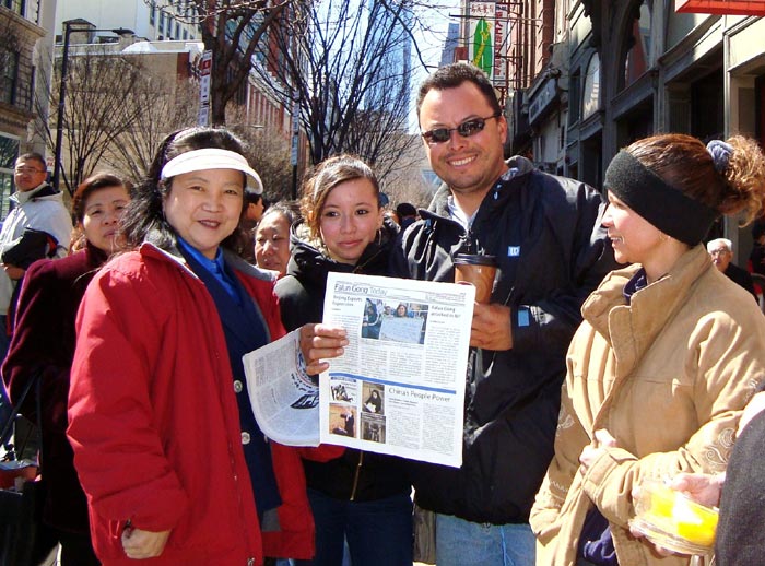 家住南泽西的西裔人士路易斯•瓦格斯(Luis Vargas)和太太卡拉(Karla)及朋友开车路过中国城,看到退出中共的横幅,立即停下车来询问是怎么回事。当知道已有五千二百多万中国人退出中共后,瓦格斯先生表示,退出中共是个伟大的历史里程碑,他向所有退出中共的中国人表示敬意与祝贺。