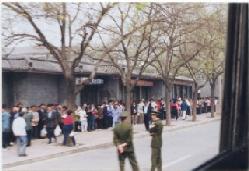 一九九九年四月二十五日当天,上万法轮功群众汇集到国家信访局所在的府右街附近。尽管人数众多,人群却出奇的安静,并且秩序井然。而维持治安的警察这时候也觉得没什么事可做而开始闲聊。我们从当时的中央电视台新闻画面和现场照片都可以看到,上访群众的身后,并不是中南海特有的红色围墙(见图);而和上访群众隔街相望的才是中南海的红色围墙,以及中南海西门。众所周知,中南海的正门是面向长安街上的新华门。事实上,四月二十五日在长安街上并没有上访群众聚集。人群主要分布于府右街和西安门大街,并且无人聚集在中南海红色围墙的一侧。也就是说,民众没有「围」住中南海,更没有发生所谓「冲击」事件。事实上,如果发生了“冲击中南海”这样的政治大事,警察绝不会如此悠闲的在一边闲聊。