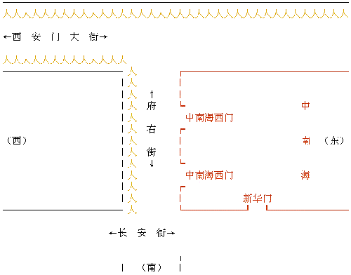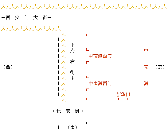 和上访群众隔街相望的是中南海西门(这里可以看到紫禁城的红色围墙)