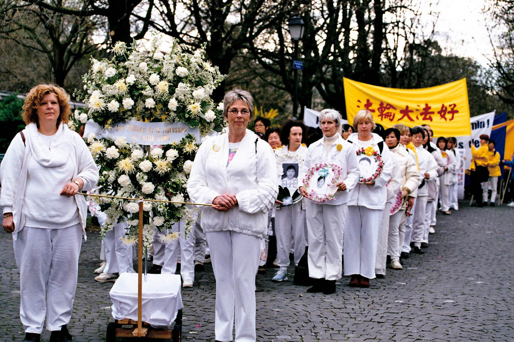 台湾学员李秋英女士也谈到她去欧洲十二国的洪法之旅,“二零零一年十月二十三日早上在西班牙马德里市炼功洪法。我手中举着‘法轮大法在西班牙’的横幅,站在广场上,心中盼着善良的人们快点来了解真相!下午举行游行,队伍壮观肃穆,所到之处吸引了不少路人,商家,连楼上的人都出来看。有一位女士对着每一位被中共迫害致死的学员照片,不断地画十字,并且哭红了眼。更有一位女士追着横幅、照片,一一地看,并且念念有词,最后忍不住抓着一位举着大横幅的外国学员询问详情。看到她那激动的表情,令人感慨。大量的真相资料也被送到路人手上。”