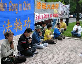 前来参加请愿的法轮功学员,有的演示法轮功五套祥和的功法,有的向过往行人发放真相传单。他们在悼念成千上万在中共残酷迫害中失去生命的法轮功学员,同时呼唤正义良知。