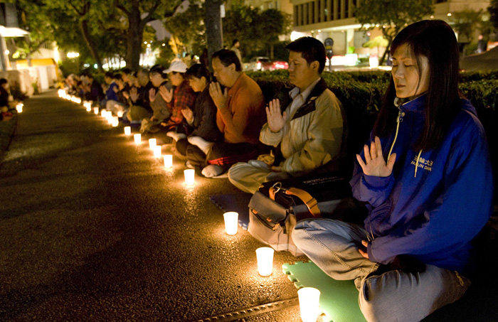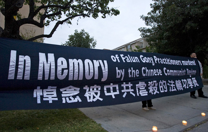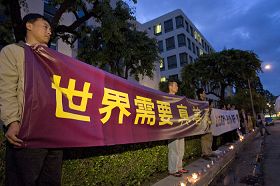 【明慧网二零零九年四月二十六日】(明慧记者李若云洛杉矶报导)为纪念十年前的四月二十五日,万名法轮功学员到中南海和平请愿,二零零九年四月二十四日晚,美国洛杉矶的法轮功学员和支持者在中领馆前,举办烛光集会,悼念被迫害而失去生命的同修,揭露中共的残暴罪行。