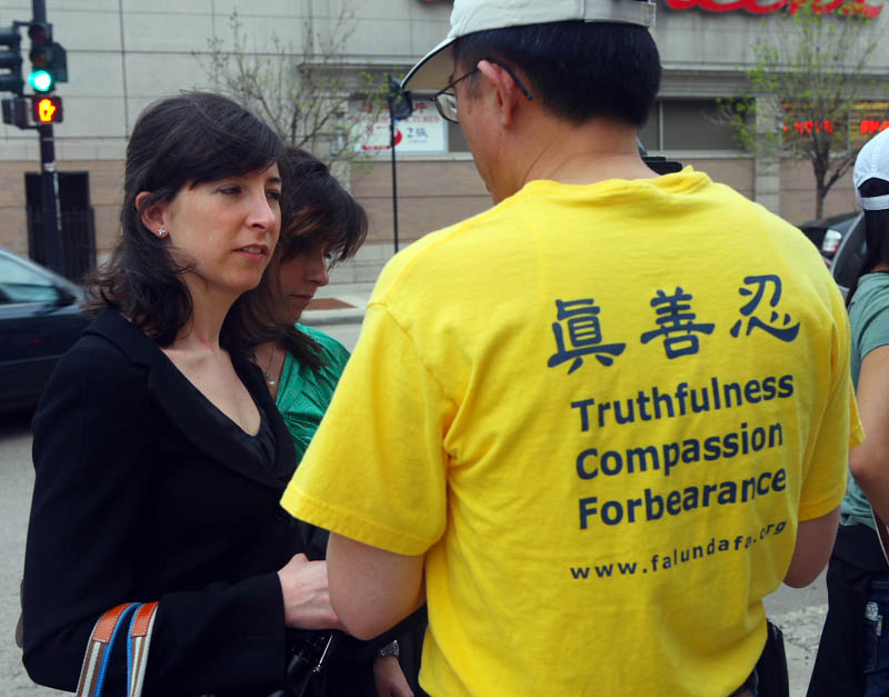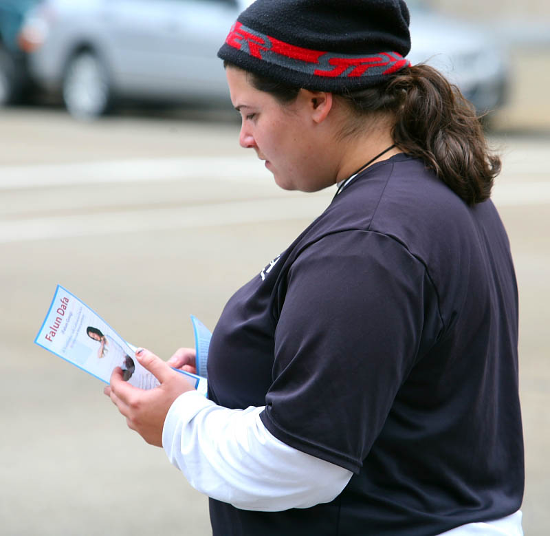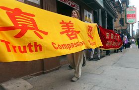 来自福州的高铭女士在布碌伦做收银员,第一次看到法轮功学员游行的她,不时的拿起相机为游行队伍拍照。她是在二零零一年首次听说法轮功的,那是从电视上看到“天安门自焚”,她说:“我并不相信。后来我在街上看到过一些法轮功学员,他们的表现,怎么可能会干那样的事?” 她表示现在越来越了解法轮功。