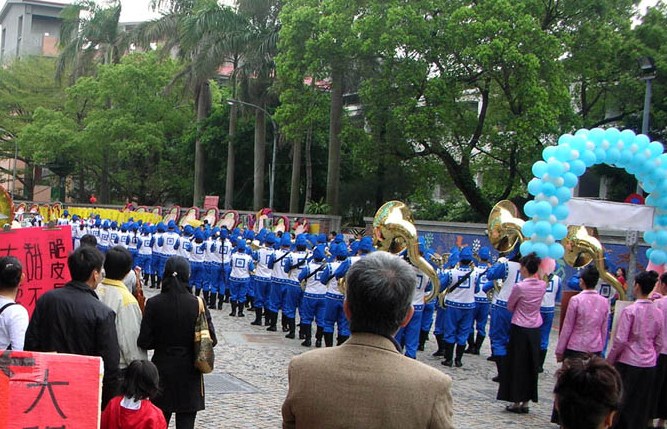 二十六日,由“天国乐团”的领引,浩大的阵容,乐声震天,之后是阵容整齐腰鼓队、优雅的美展天使、横幅关东旗队以及美丽的仙女队,在莺歌陶瓷老街举办了踩街造势活动。因适逢周休假期,沿途吸引了许多民众的目光,也把“真善忍国际美展”的福音广传出去。