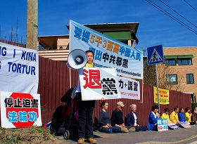 二零零九年四月二十五日下午,挪威法轮功学员来到位于奥斯陆的中使馆前,纪念“四•二五”万名法轮功学员北京和平上访十周年,揭露中共对法轮功的迫害,同时声援中国五千三百万勇士退出中共邪党及组织。