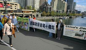 二零零九年四月二十五日,澳洲墨尔本市法轮功学员来到位于市中心的王子桥上,用手中的一面面横幅筑成一道真相墙,吸引着过往行人的目光,向世人讲述自十年前那个波澜不惊的日子开始,法轮功学员十年风雨路。