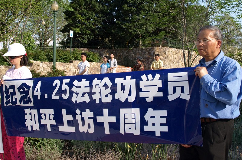 二零零九年四月二十六日下午,美国首都华盛顿及周边地区的部份法轮功学员在中共驻美新建使馆前集体炼功,纪念“四•二五”法轮功学员和平上访十周年。