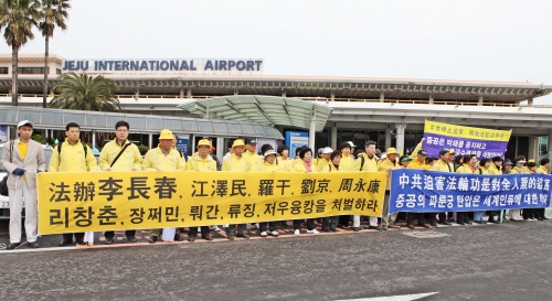 ![]() 中共政治局常委李长春访韩,韩国法轮功学员在济州机场手举“谴责迫害”横幅,要求法办迫害法轮功的元凶。 |