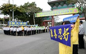 ![]() 在西归浦徐福公园正门手举“法轮大法好,真善忍好”横幅的法轮功学员 |