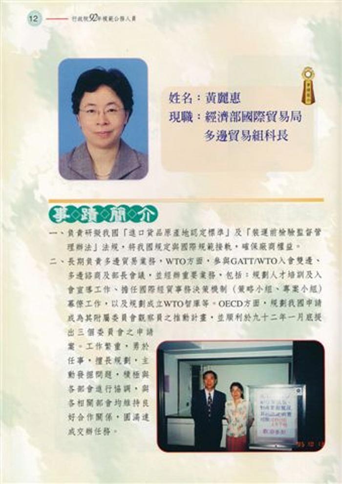 ![]() 黄丽惠荣获行政院模范公务人员表扬,图为模范公务员事迹简介 |