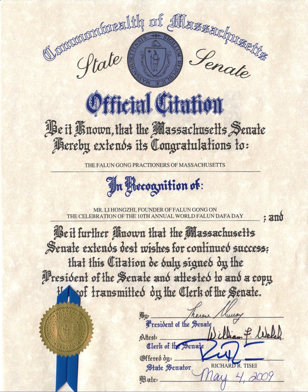 麻州参议院献上最美好的祝愿,祝不断取得成功。此褒奖状由参议院主席签署并由参议院秘书作证明和传递。