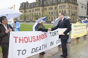 ![]() 二零零九年五月七日,加外长出访中国前,加拿大国会议员鲍瑞斯·瑞兹纽科斯基与国会山前请愿的法轮功学员一一握手 |