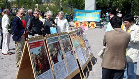 五月九日上午十一点过后,刚刚下过一场小雨,天气凉爽,空气很新鲜。斯德哥尔摩市中心国王花园的很多游客被法轮功(又称法轮大法)优美的炼功音乐,学员宁静祥和的炼功场面,以及法轮大法洪扬全世界、法轮功学员在中国无辜遭到残酷迫害的真相展板所吸引,不少行人都驻足观看,并主动上前和法轮功学员交谈。还有的人对功法很感兴趣,当场就要学功。