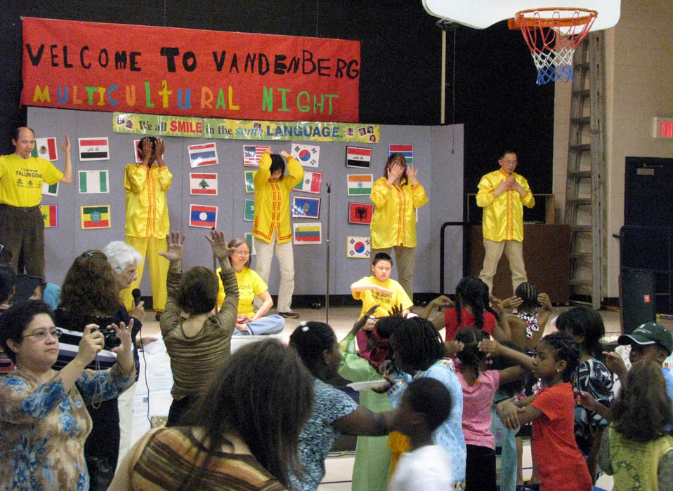 范登堡小学在每年五月举办一次多文化节日庆祝活动。学生的家庭背景很广,来自二十九个国家,说着二十三种不同语言。家长们带来具有各个国家和地区特色的美味食物,学生们身着具有民族特色的服装,挤满了学校的礼堂。庆祝活动上,安排有多种活动节目,如舞蹈、歌咏等。今年,法轮功学员的功法演示无疑给范登堡小学的多文化庆祝活动增添了异彩。