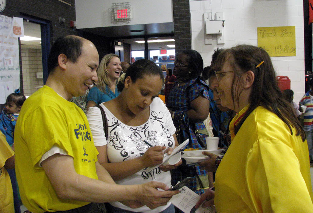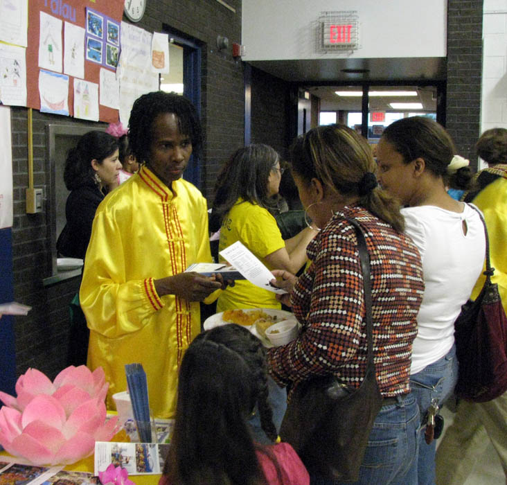 学员登台展示了五套功法,深受教职员工、家长和学生的欢迎。他们很多人当即在台下跟着台上的学员学做动作。功法演示结束后,很多人来到法轮功摊位索取真相资料,并询问炼功点信息,表示要学炼法轮功。