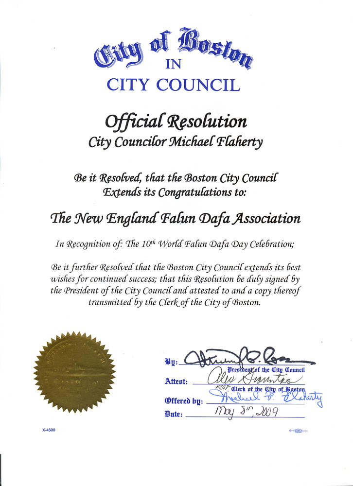 决议:波士顿市议会恭祝新英格兰法轮大法协会,庆贺第十届世界法轮大法日。