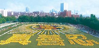 为庆五一三“世界法轮大法日”,台湾六千余名法轮功学员于五月九日将指导修炼的《转法轮》这本书,金光灿烂地排演出来。