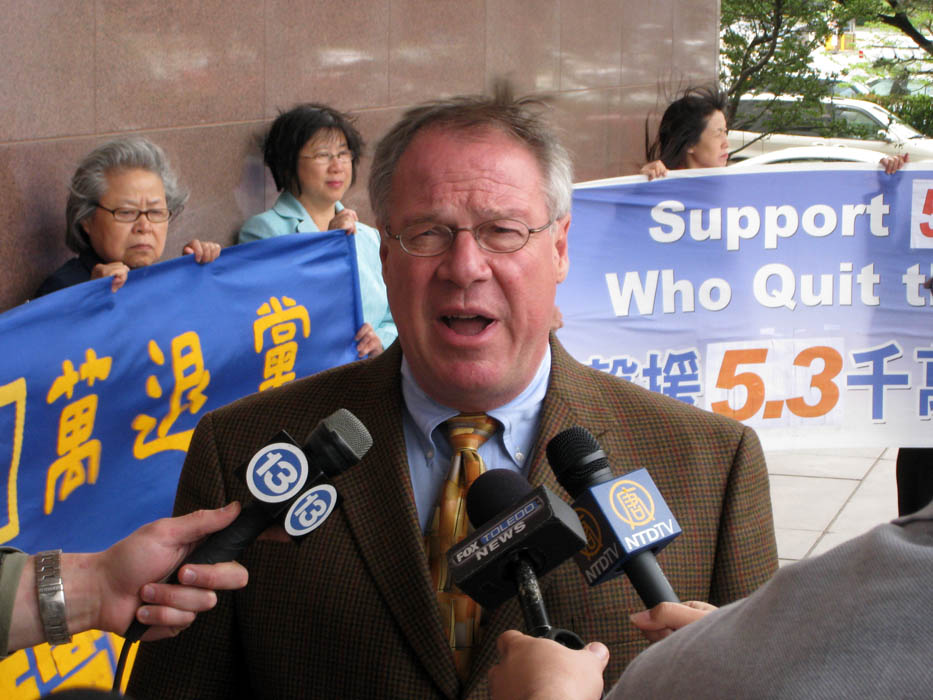 俄亥俄州特来多市市议员麦克•柯林斯(D.Michael Collins)在五月九日特来多市的集会上发言,并接受了当地媒体十三频道、FOX电台和新唐人电视台的联合采访。他说:“当我听到中国人退党的活动时,我觉得我并不惊讶,我觉得我了解中共;但当我真正和他们交谈后,我才知道关于迫害,关于在中国不止一个的受迫害团体所正在承受的境况,我非常惊讶,也非常难过,所以我站出来支持他们。坦白地讲,我认为整个世界都应该站出来!(Frankly say, the world should stand up!)”