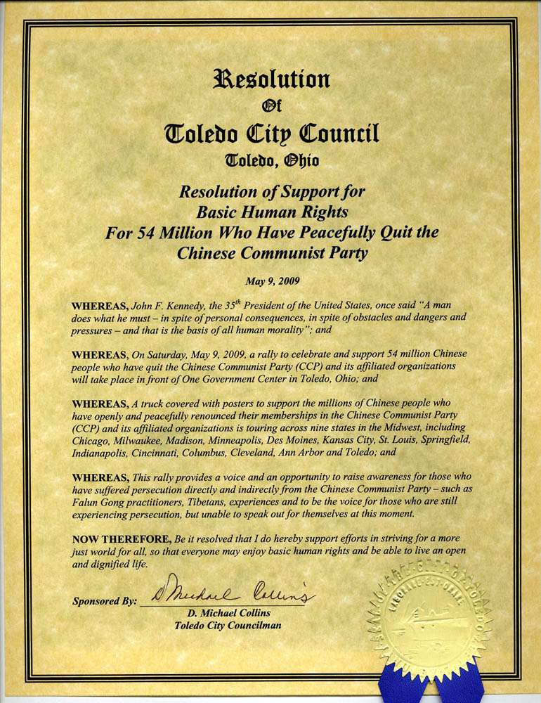 ![]() 俄亥俄州特来多市议会颁发褒奖支持中国民众退出中共 |