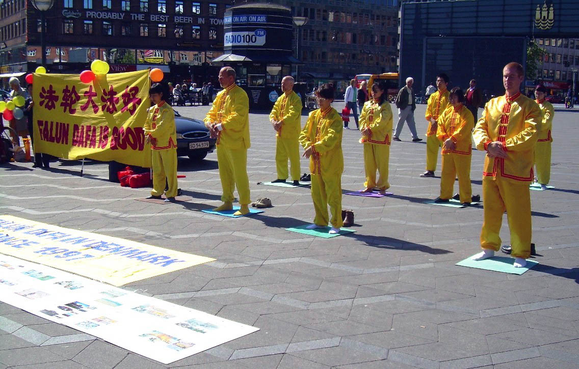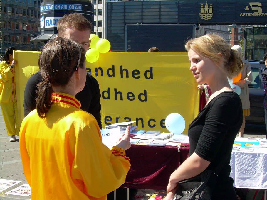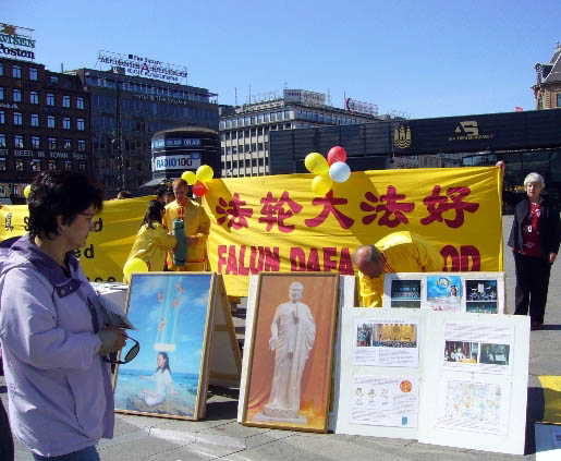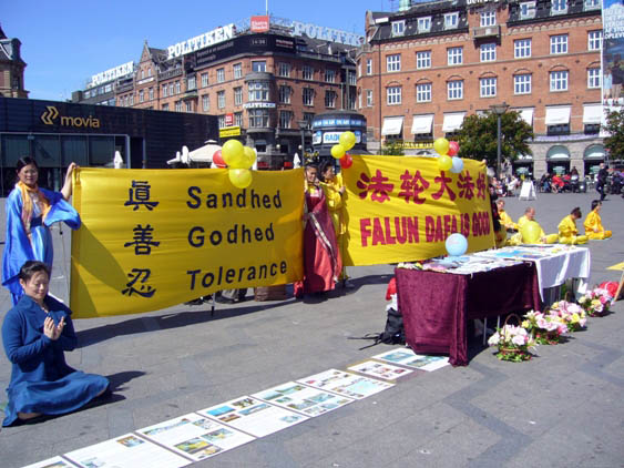 五月的哥本哈根春暖花开,正是旅游旺季,天气晴朗,游客络绎不绝,“法轮大法好”的横幅在阳光下格外引人注目。法轮功学员身着金灿灿的炼功服,在广场上随着音乐炼功,吸引路人纷纷驻足观看。