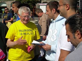 ![]() 八十二岁的丹麦退休工程师鲍尔先生,学炼法轮功十一年,身心受益,神清气爽,白发里长出了新的黑发。他热情地向人们介绍法轮功。 |