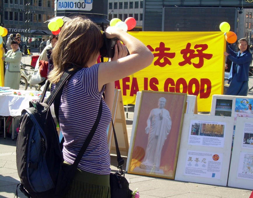 女大学生克理斯琴被法轮功学员炼功场面的祥和所感动,她举起相机拍下了这美丽的场景,并在制止中共迫害法轮功的签名簿上郑重写下了自己的名字。她表示:“对于法轮功的迫害是错误的,法轮功在中国大陆不应被禁止,我想人们都理解法轮功是祥和的,人们信仰法轮功是件好事情。”