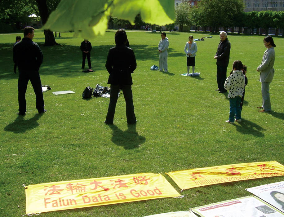 ![]() 哥本哈根法轮功学员在公园里炼功 |