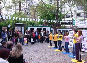 悠扬的炼功音乐、舒缓优美的功法、修炼者祥和的精神风貌,吸引了众多的路人。一旁悬挂的展板上介绍法轮大法是源于中国的传统修炼方法,以“真善忍”为原则,已洪传世界一百多个国家。然而在中国,中共恶党不能容忍人们对“真善忍”的信仰,发动了对善良的法轮功学员的残酷迫害,甚至活体摘取法轮功学员的器官牟取暴利。中共的种种暴行被越来越多地揭露出来,受到国际社会的谴责。