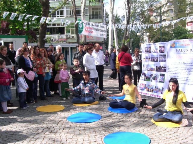![]() 法轮功学员演示功法,吸引了很多路人 |