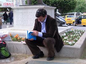 ![]() 被法轮功吸引的一位男士,捧着大法书读了许久 |