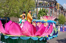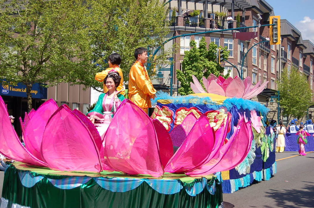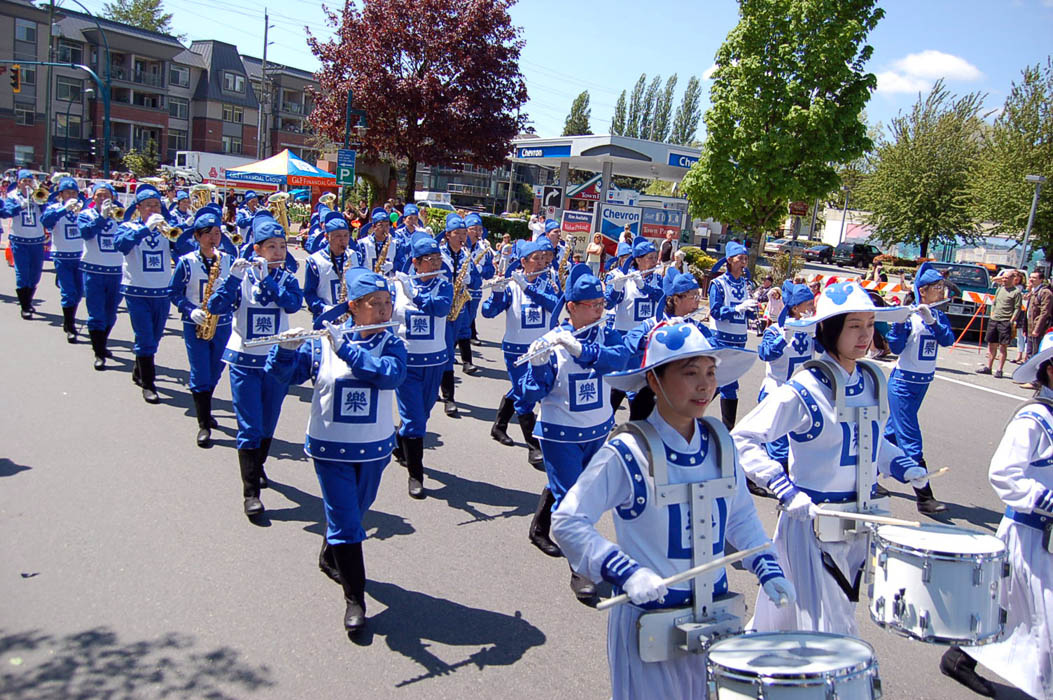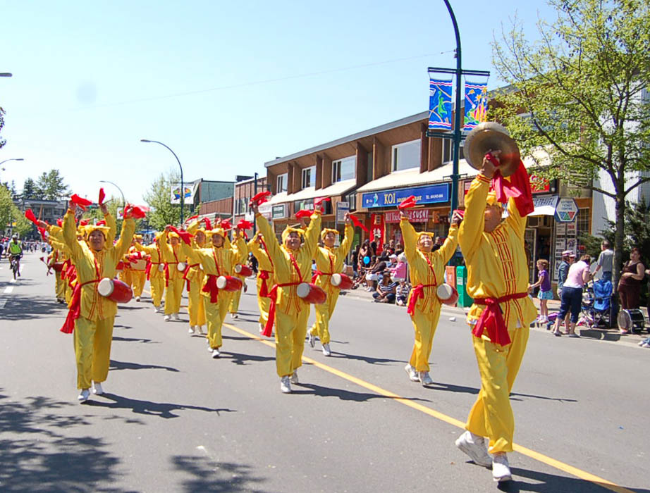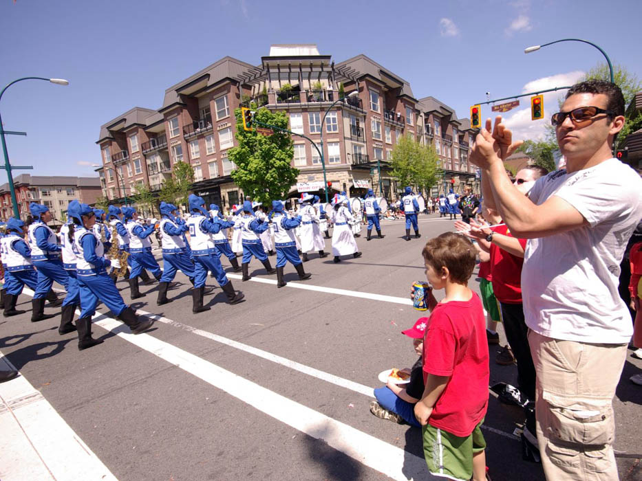 温哥华法轮大法天国乐团第一次穿上亮丽的新装出现在游行队伍里,格外引人注目,沿途观看游行的民众伴随着乐团的鼓点舞动、喝彩。赏心悦目的莲花花车和主要以老年学员组成的腰鼓队、小弟子的舞蹈队,也不断引来观众的阵阵掌声,许多人举起相机留下珍贵镜头。