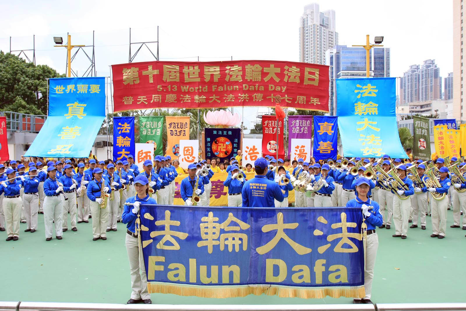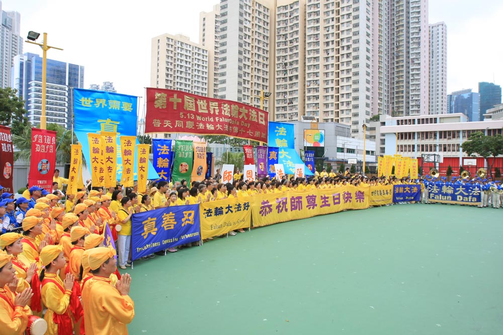 早上十时,祥和的炼功音乐在九龙长沙湾游乐场响起,数百学员在九龙长沙湾游乐场集体炼功。中午过后,天国乐团响亮雄伟的演奏,揭开了世界法轮大法日的庆祝活动。数百大法弟子列好队形,双手合十,喜气洋洋的齐声恭祝师尊生日快乐,随后高唱“法轮大法好”。