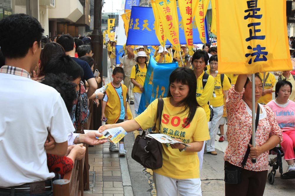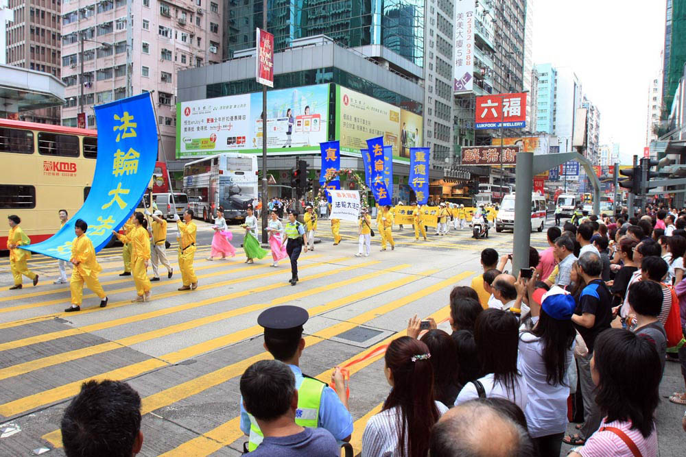 下午二时,队伍由天国乐团领头起步游行,途经九龙区最热闹的街道,他们手持大大小小的幡旗,推动着大型的《转法轮》经书模型、牌匾和花车,以及各式各样的幡旗等,吸引许多市民和游客观看,甚至巴士上、旅游汽车上的乘客都投以关注的目光,没有错过了解真相的机会。尤其是来自大陆的游客纷纷表示惊叹。一位年轻漂亮的女游客对采访的记者说:“我是从国内过来的,没有见过,觉得很震撼!”另一位女士拿着法轮功的真相传单和光碟,高兴地说:“很雄伟!”问她是否支持这次活动,她连声说:“支持!支持!”