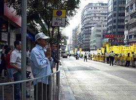 ![]() 一名南亚裔游客深受感动,双手合十,遥遥向行经的法轮功学员们致敬 |