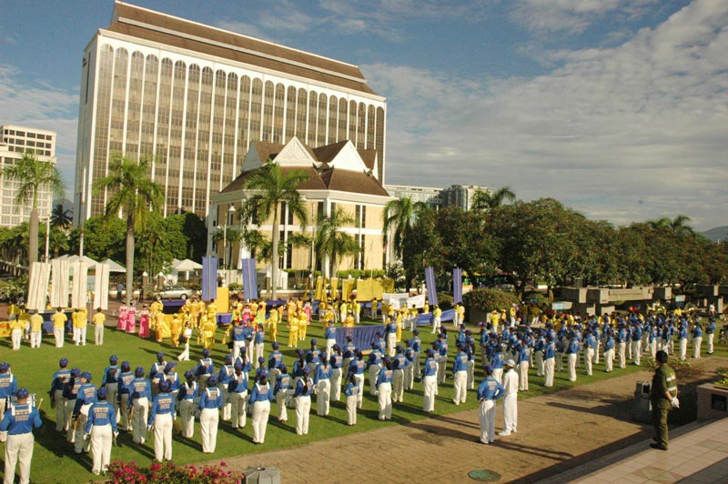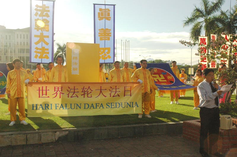 上午八时起,手举着横幅的法轮功学员,及天国乐团、腰鼓队、仙女队排列整齐,聚集在怡保市政局前欢庆节日,场面壮观。活动吸引了数家媒体前来采访,法轮功学员在现场举行了记者招待会。发言人之一郑先生宣读道:“五月十三日已成为一个世界性节日。每年五月十三日,不同肤色、不同语言、不同民族、不同地域的人们都在欢庆。由中国大陆传出来的法轮大法给世界亿万民众带来福祉。”
